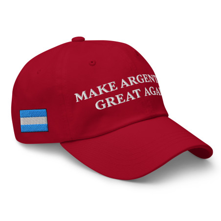 Gorra "Make Argentina Great Again" en color rojo y con la bandera de Argentina. Todo bordado en color: letra blanca y bandera de Argentina en un lateral de la gorra.