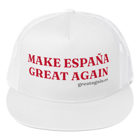 Gorra "Make España Great Again" en color blanco y letra roja. La gorra tiene una visera plana y cuenta con un cierre de plástico a presión para ajustar la gorra. La parte trasera es de rejilla lo que reduce la transpiración.